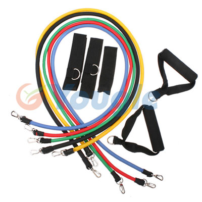 There's a reason why so many fitness programs include resistance bands--THEY WORK! Turn this classic, simple exercise tool into something new with this professional quality 11-Piece Resistance Band Set, made from natural rubber latex that will go the distance! Featuring durable metal hooks (not cheap PVC or plastic) and comfortable, cushioned foam handles, this resistance band set is ideal for those with limited space, no time for the gym, or who want to work out in the privacy of their own home without sacrificing results or variety. Use them for yoga, P90X workouts, easy muscle toning, or other exercise routines. In the box: * Yellow band: 10LB * Green band: 15LB * Red band: 20LB * Blue band: 25LB * Black band: 30LB * Door Anchor * Case * Handles (2) * Ankle Straps (2)
